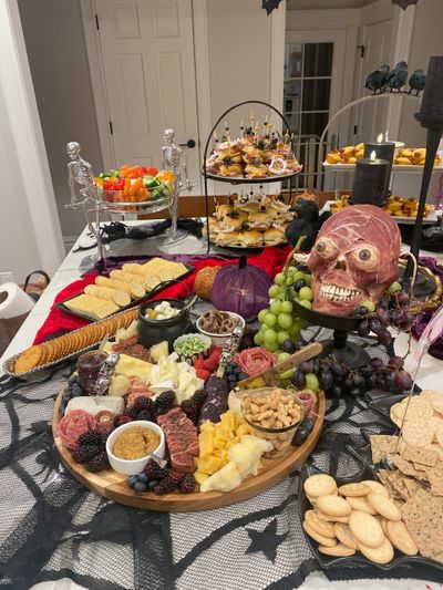 Skeleton Charcuterie Board (skull meathead, prosciutto eyeballs, cheese, crackers, fruit)